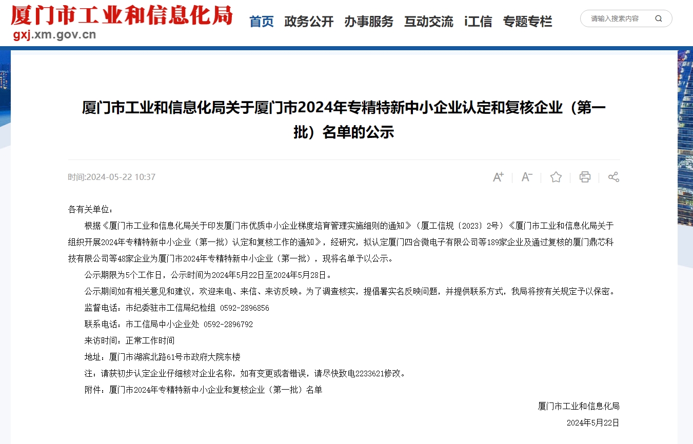 5月22日,厦门市工业和信息化局公布了《关于厦门市2024年专精特新中小企业认定和复核企业(第一批)名单的公示》,厦门long8龙8国际网络科技有限公司成功顺利获得2024年度厦门市专精特新中小企业认定。
