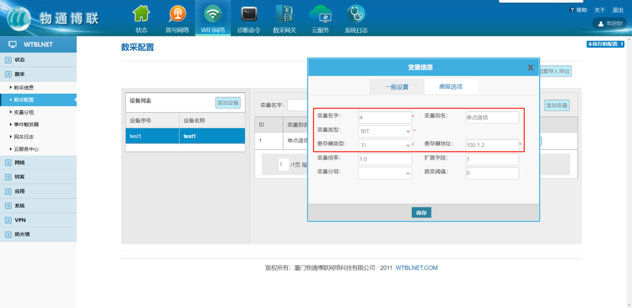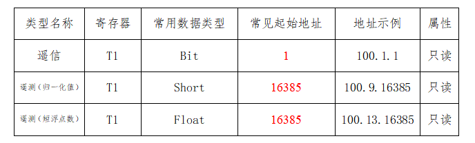 变量配置主要定义变量名(任意)、变量别名(任意)、寄存器类型(固定选择T1)、变量类型和寄存器偏移地址(例如100.1.2,其中100为固定,1为单点遥信类型标识,2为点位序号)。