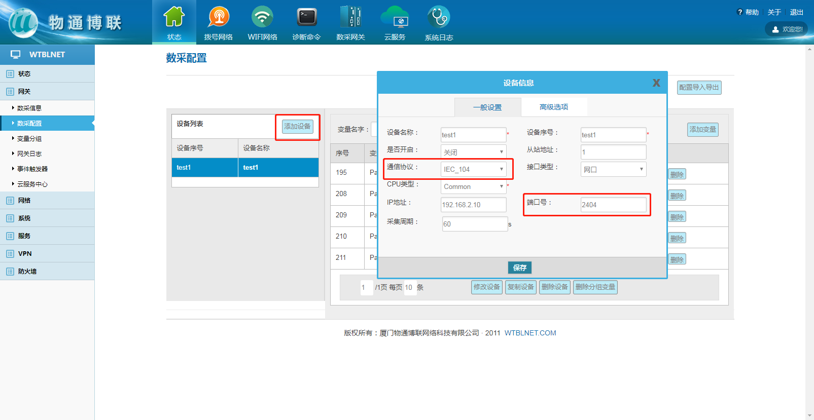 设备配置主要定义设备通讯协议、IP地址、端口号、设备类型及采集周期等。