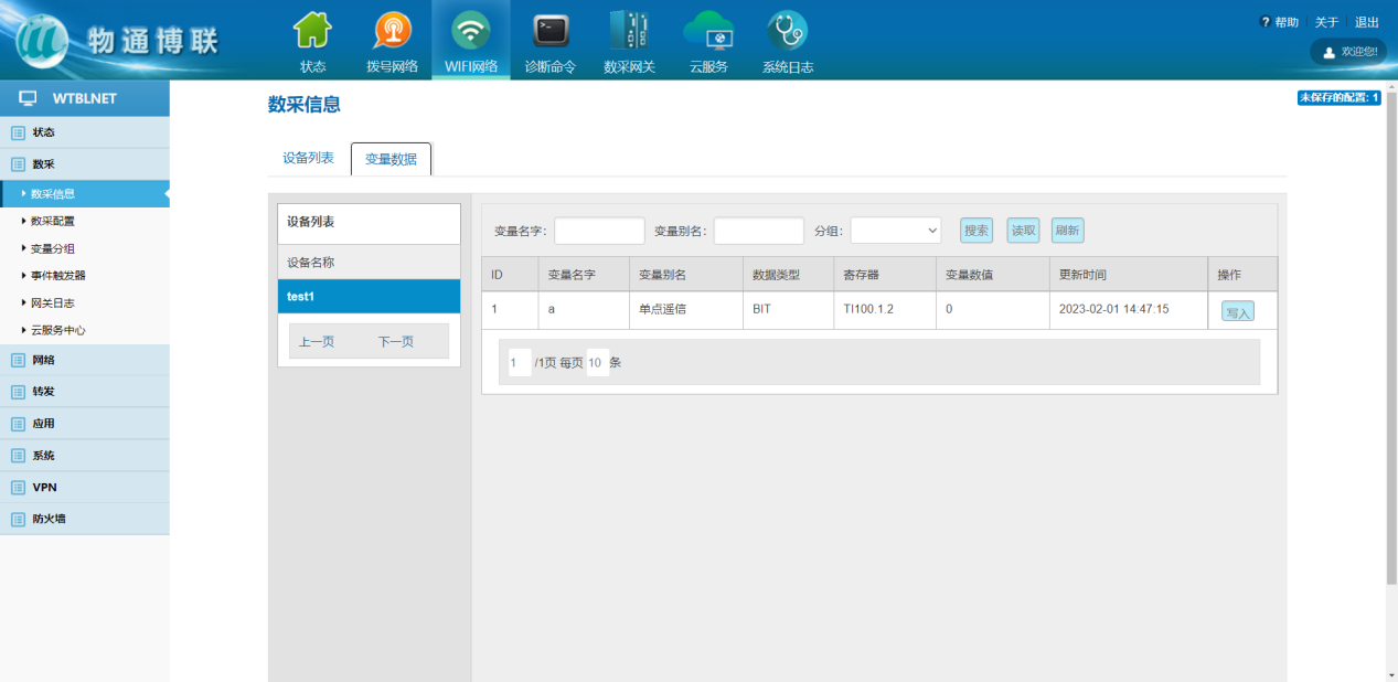 数采配置(设备信息+变量参数)完成后,重启采集程序并生效配置,即可在:数采信息---变量数据---设备名称 中看到采集上来的数据。