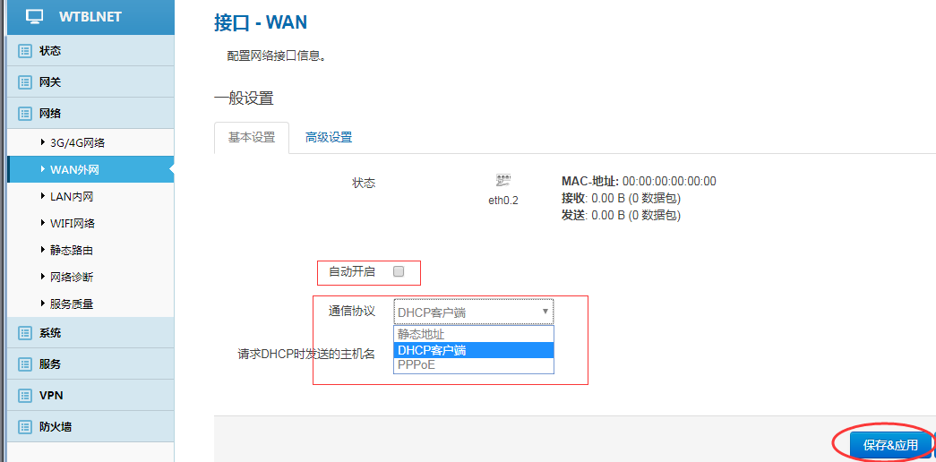 勾选自动开启,选择通信协议(静态地址、DHCP客户端、PPPOE,三选一),保存&应用。