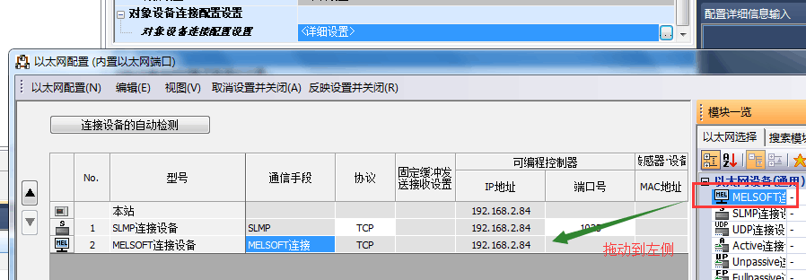2、对象设备连接配置设置中新增“MELSOFT连接设备”通讯方式。