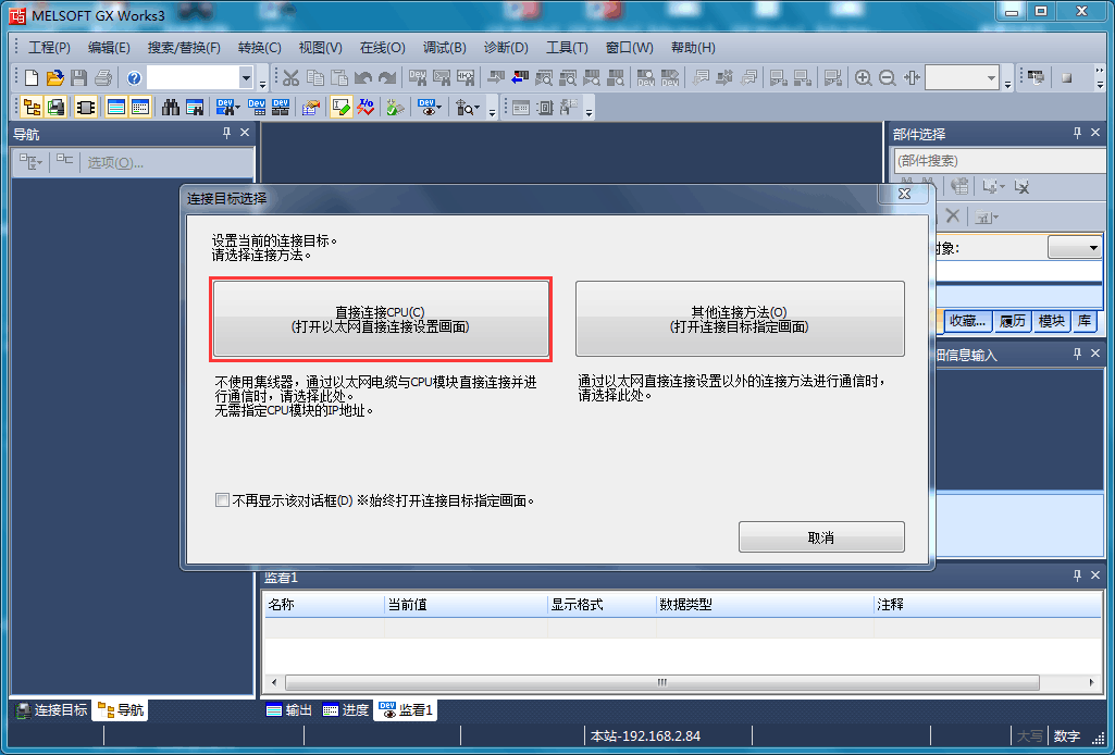 2、“CPU模式”设置,“经由集线器连接”,填写控制器的IP地址。