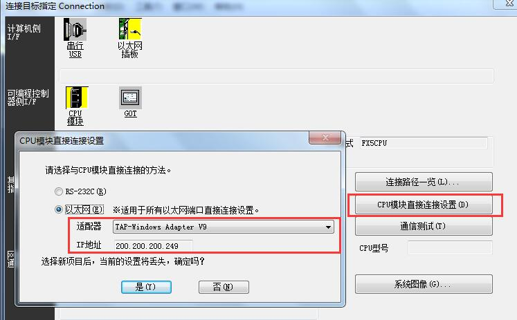 3、CPU模块直连连接设置以太网适配适配器“TAP-WindowsAdapterV9”。