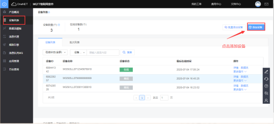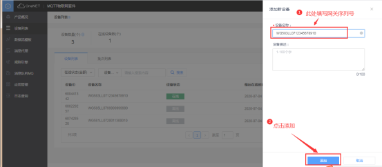 可进入OneNET平台的对应产品中获取网关云服务中心所需要填写的ID和KEY。