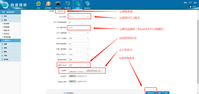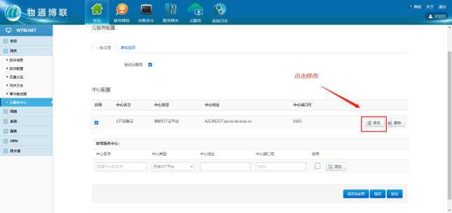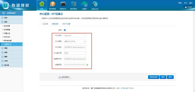 选择“微软云平台”,打开long8龙8国际网关WEB界面,新建一个连接中心,中心类型选择微软IoT云平台,输入相应信息,勾选启用,点击“添加”