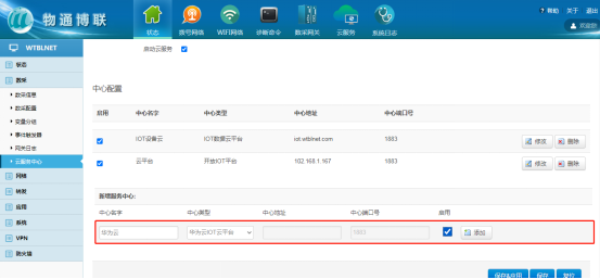(4)第三方平台设备接入:例如阿里云、华为云、百度云等第三方设备接入平台,网关已开发好适配此类第三方平台的物模型接入,例如华为云,填写相关连接参数,配置内容,即可将数据上传至华为云IOT设备接入模型中(网关支持的第三方接入云,都有详细的配置手册)。