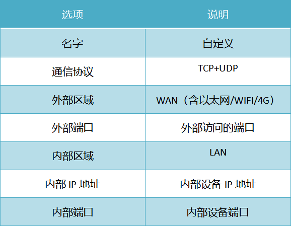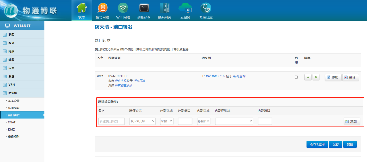 下载中心 视频中心 常见问题 售后服务 工业网关 设备快线 数据云平台 联网设备 问答百科 工业网关如何配置端口映射? 时间:2022-10-26 09:39:53 点击:5167 关键词:工业网关,网关配置,端口转发 问题:工业网关如何配置端口映射? 回答: 网关配置界面—防火墙—端口转发 端口转发允许来自Internet的计算机访问私有局域网内的计算机或服务 使用场景:端口转发是将发往外网的一个端口的通信完全转发给内网一个地址的指定端口 上一篇:如何顺利获得long8龙8国际工业网关实现网口设备远程上下载? 下一篇: 工业智能网关支持的电压范围?