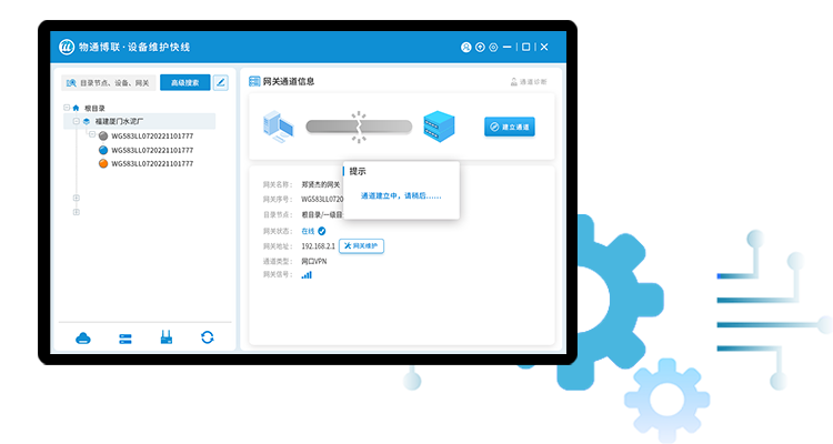 使用long8龙8国际的设备维护快线,顺利获得账号登录后,找到相应网关建立维护通道,就可以搭建通往设备现场的网口通道和串口通道,让工程师不用远程出差就可以像到现场一样,实现随时随地远程维护。