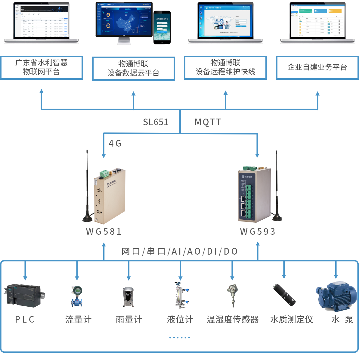 顺利获得long8龙8国际工业智能网关采集PLC、流量计、温湿度传感器、雨量计、液位计等等相关设备数据,将流量、流速、水位、水深、温度、湿度、水压等等数据顺利获得边缘计算、数据标准化后以4G/WIFI等网络方式顺利获得MQTT/SL651等协议传输到广东省水利智慧物联网平台或者企业自建业务平台。