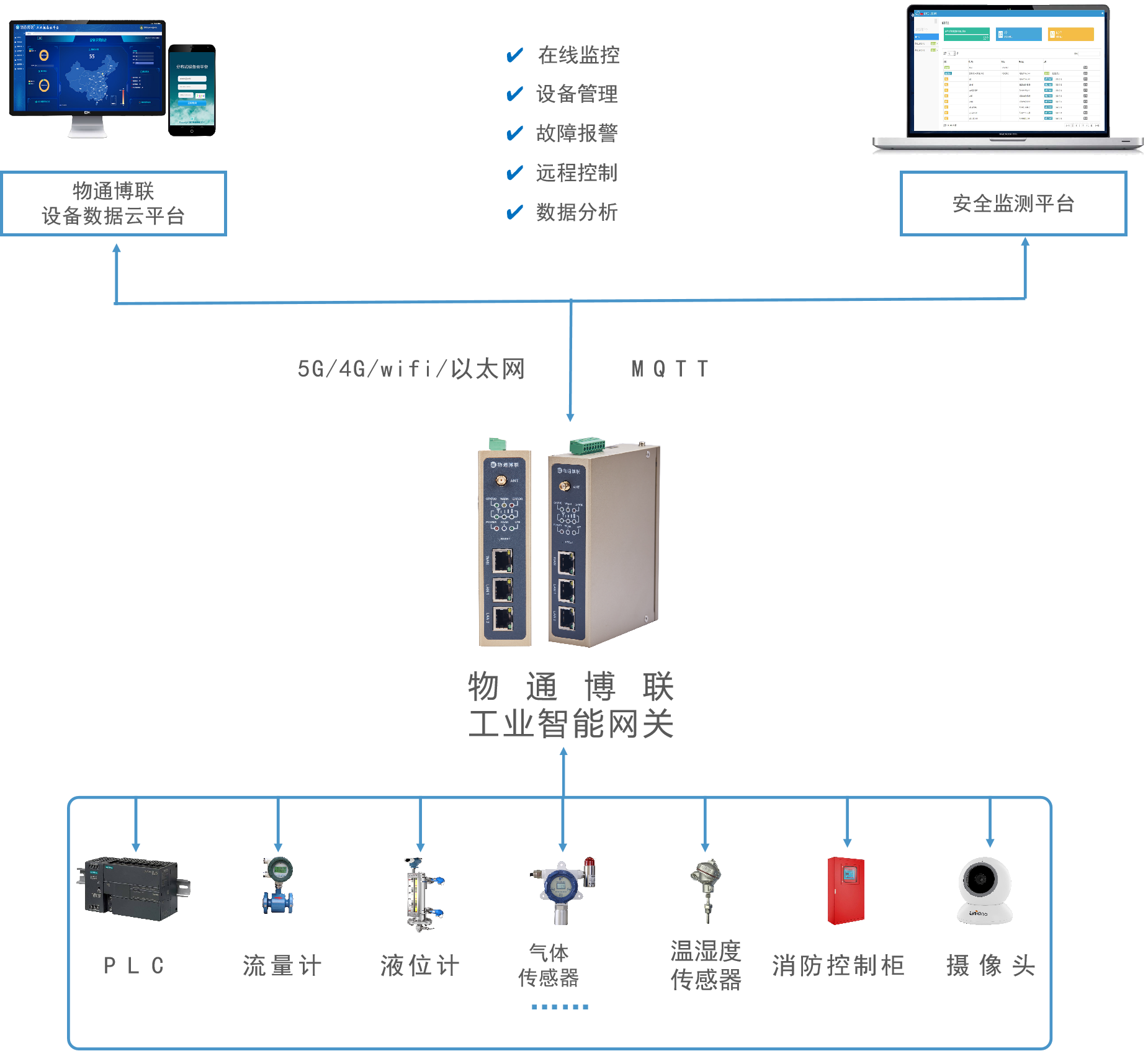 long8龙8国际工业智能网关支持接入液位计、流量计、温湿度传感器、气体传感器及消防控制柜PLC等设备,实时采集液位、流量、温湿度、危险气体浓度及消防柜运行状态等数据,并顺利获得5G/4G/WIFI/以太网的方式对接到油库储量安全监测平台或国家监管中心内,快速搭建分布式多站点的监控网络,操作简单、配置方便。