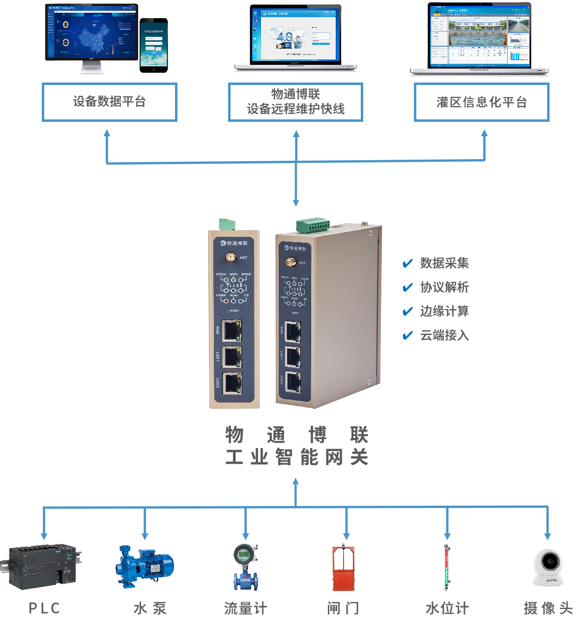 网关支持采集PLC、传感器、仪器仪表、摄像头等设备数据,并给予5G/4G等无线通信方式对接到智慧灌区信息化平台中。