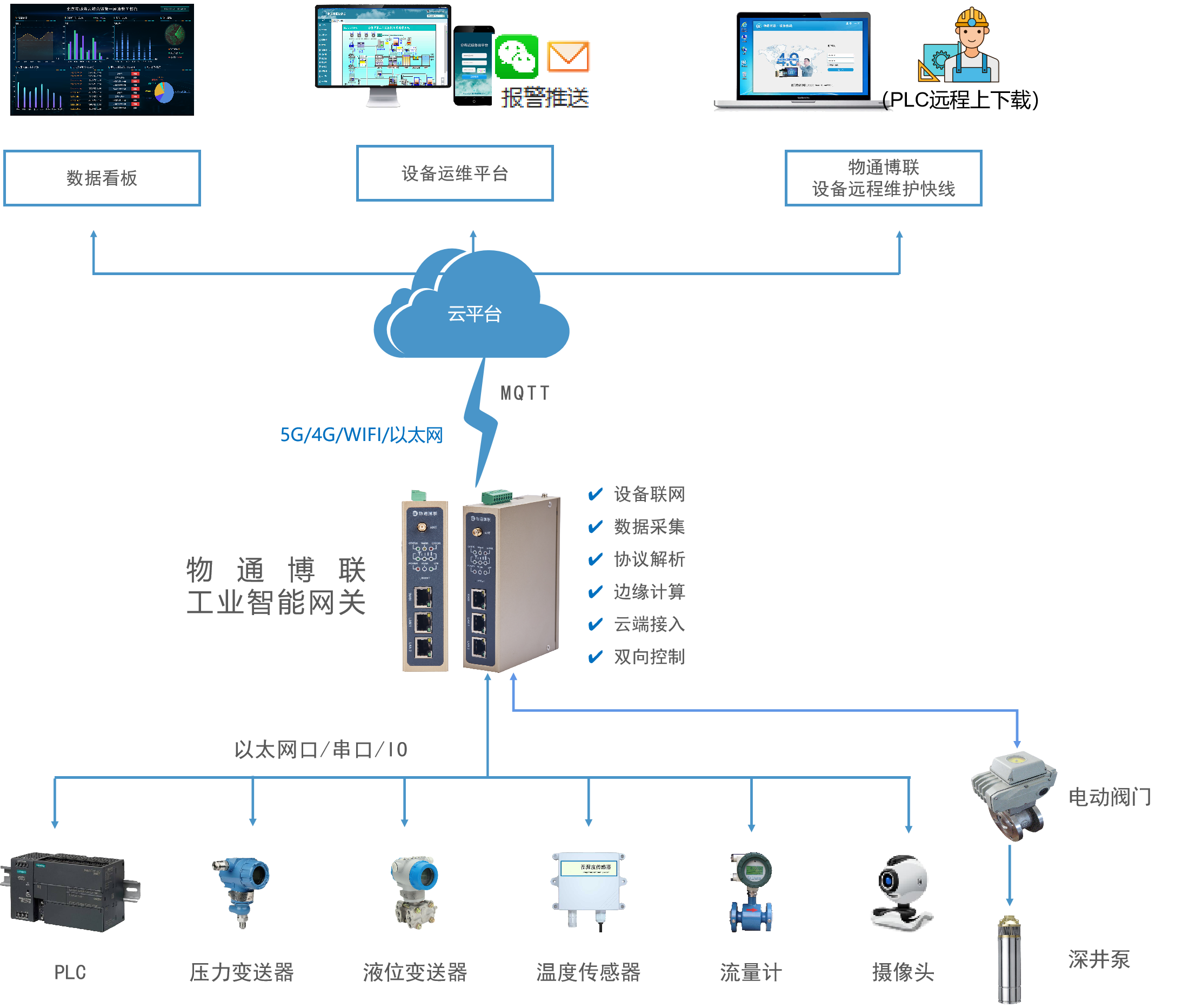 顺利获得long8龙8国际工业智能网关采集解析现场泵站中的PLC、压力变送器、温度传感器、液位变送器、流量计等设备运行状态和运行数据,再顺利获得4G网络将数据上传到云平台进行远程监控,平台可视化展示泵站数据和运行情况,管理运维人员可以顺利获得PC端平台和手机端小程序随时随地监控现场泵站情况,实现远程管理、故障报警、远程维护、数据分析等功能,同时云平台支持下控网关,可以对电动阀门写入开关值,实现远程启停泵站设备,做到实时在线、无人值守,降低运维人力成本。