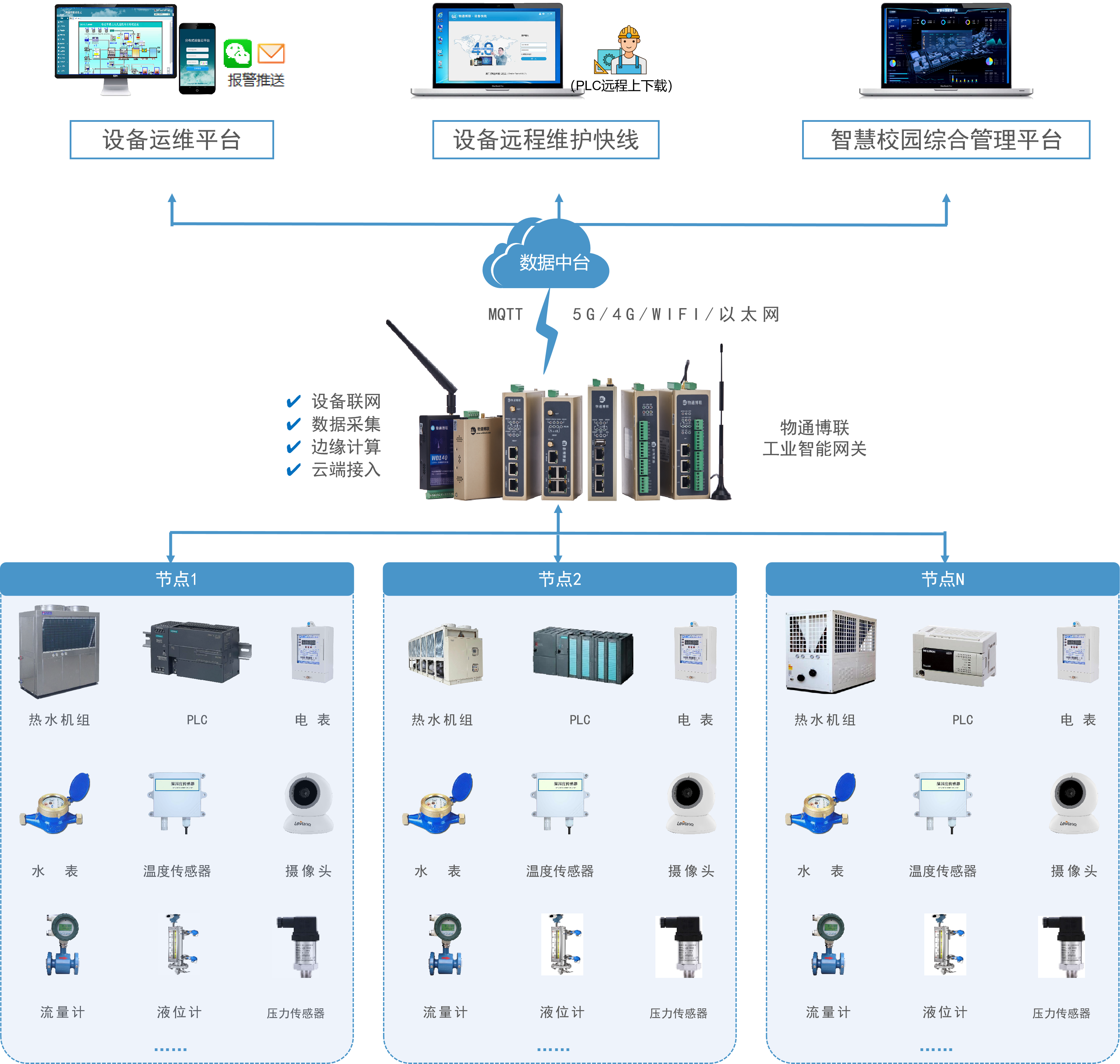 现场控制器PLC汇集温度传感器、液位传感器、溢流开关、电磁阀、水表、空气能设备、电表、变频器、水泵、继电器等设备,对这些设备进行逻辑控制,long8龙8国际工业智能网关顺利获得以太网/串口方式从现场设备采集设备的各项数据(设备运行状态、温度、液位、出水压力、耗电量、制热量)等信息,利用边缘计算能力对数据进行处理从而完成数据标准化,然后顺利获得4G网络把数据上传long8龙8国际数据中台,long8龙8国际数据中台将数据转发到设备远程监控管理系统,实时监控热水机站状态,支持对热水机组进行远程控制,实现不同时段、不同天气温合理调节机站运行状态、设置温度,支持故障报警,告警异常及时通知到运维人员,提前发现及时处理,提升服务质量,预防事故发生,降低运营成本,达到节能减排目的;同时long8龙8国际数据中台将数据接入到智慧校园综合管理平台和校园一卡通系统,方便学生和教职工使用,提高学校管理效率。