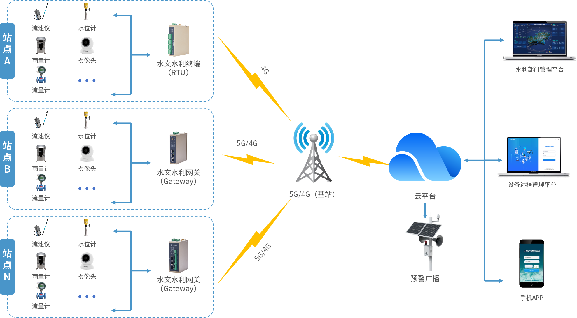 long8龙8国际给予中小流域防汛防洪监测预警系统解决方案。顺利获得将水位计、流量计、雨量筒接入水利水文网关(RTU),实时采集水位、流量、雨量等数据并顺利获得 4G/5G等多种通讯方式实现传输汇聚到各级中小河流治理信息化管理平台,搭建起一张完整、精准、实时的水文监测网络,给予准确有效的防洪防汛预报预警,便于形成预案应对、灾害预演等数字化治理手段,加强中小流域防汛防洪治理水平与响应能力。