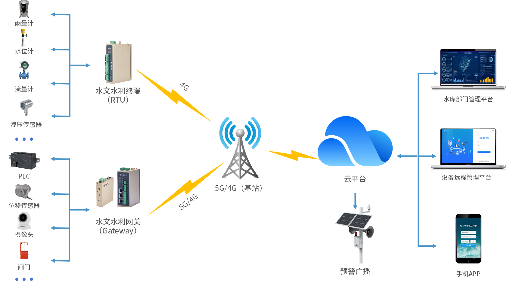 水位、降雨量、流量等数据的超过上下限,以及硬件设备的故障、电压电流异常等情况自动报警,云平台以发送短信、拨打电话、微信公众消息、声光报警器等多种形式示警。